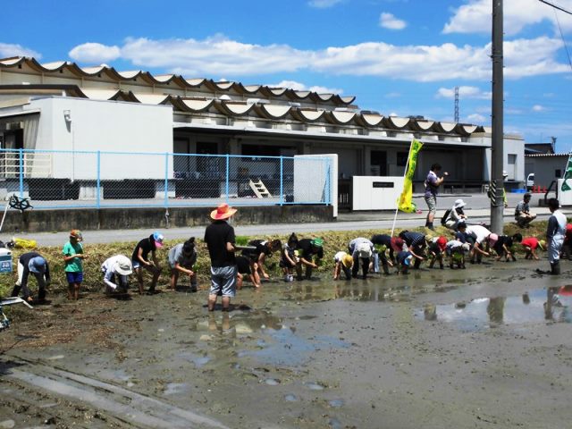 |   | 2017年5月27日 南部給食センター(定国町)前の田んぼにて田植え体験を行いました。 20組55名の親子に参加いただき、泥んこになりながら楽しく田植えを進められたと思います。 |
