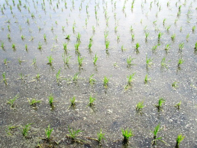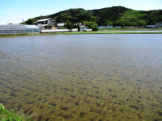 | 2017年6月2日 まだみなさんの足跡が残る田んぼに水が張られました。 稲はまだ小さいですが、田んぼらしくなってきましたね。 |   |