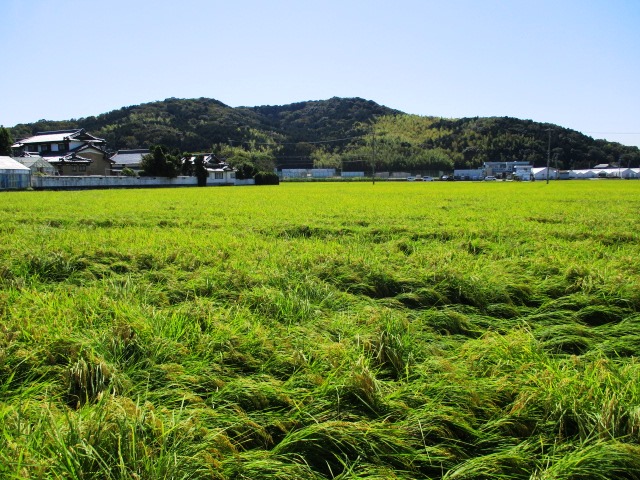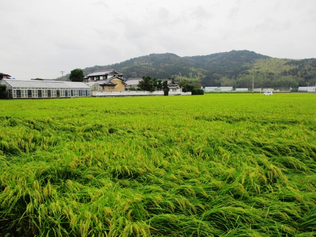 |   | 2017年9月22日 先日の台風18号の影響で少し倒れ気味ですが、稲刈りに向けてしっかり育ってくれています。 |