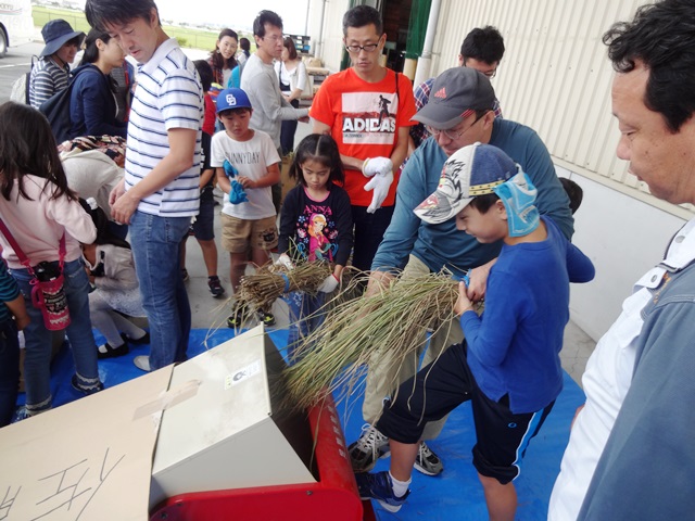 | 2017年10月7日 前日からの雨のため稲刈り体験は中止となりましたが、代わりに脱穀体験を開催しました。 みなさん脱穀は初体験で、とれたてのモミ米をお土産袋いっぱいに詰め込んでいました。 |   |
