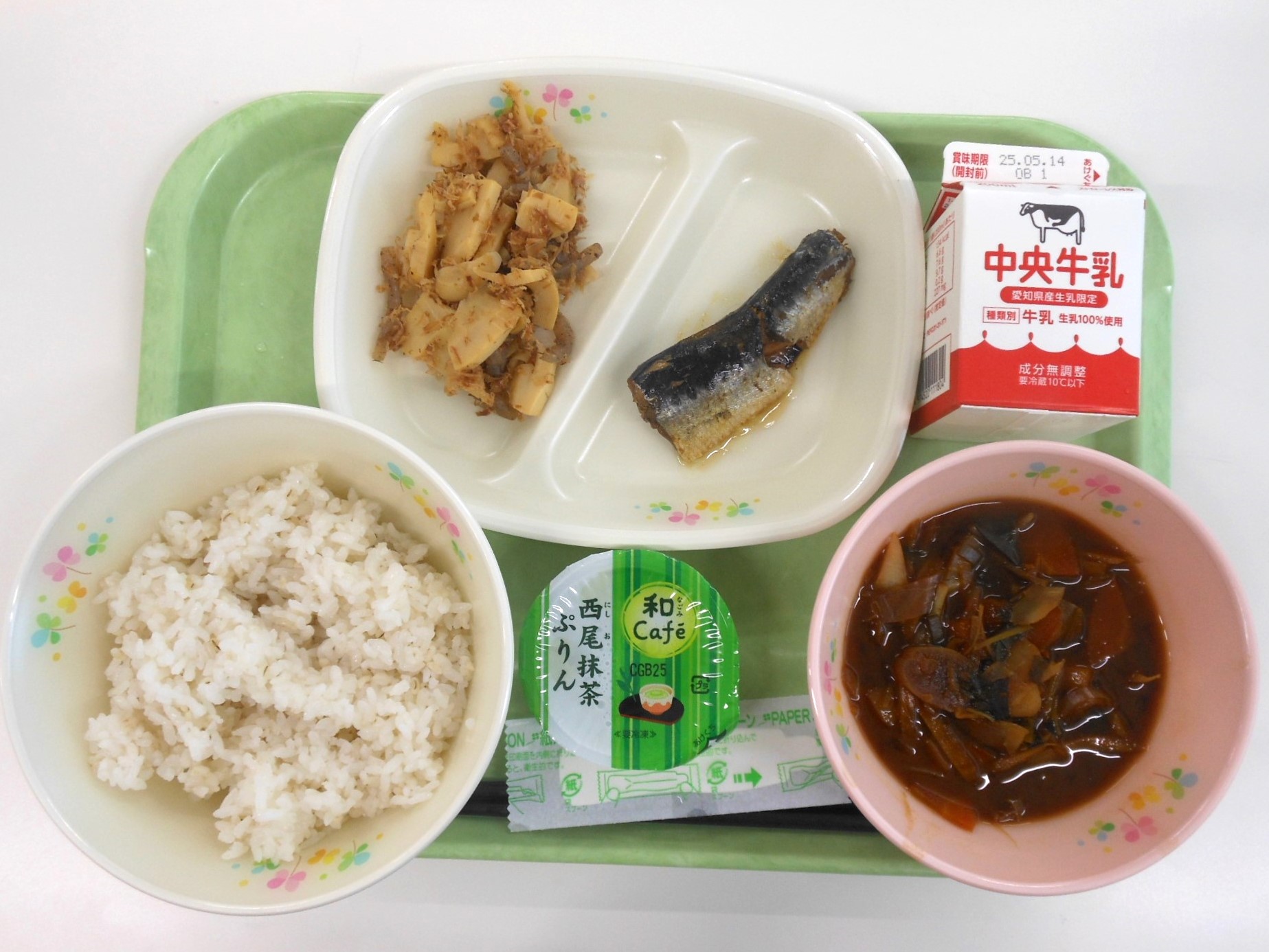 ・麦ごはん ・牛乳 ・三根五菜みそ汁 ・いわしのしょうが煮 ・たけのこの土佐いため