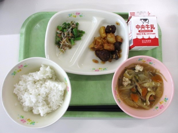 ・ごはん ・牛乳 ・新玉ねぎの豚汁 ・とり肉の竜田揚げ ・じゃこてん茶ふりかけ
