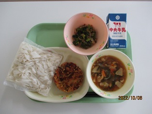 10/06![]() (きしめん、 五目きしめんのつゆ) ・牛乳 ・野菜かき揚げ ・小松菜のおひたし |