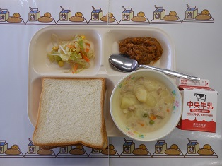03/12![]() ・牛乳 ・クリームシチュー ・スラッピージョー ・野菜の えごまドレッシング和え |