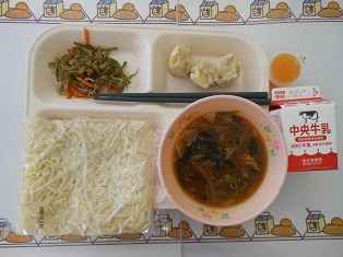 03/18![]() (中華めん、 ベジ担ラーメンのつゆ) ・牛乳 ・コーンしゅうまい ・茎わかめの中華いため ・ミニ蒲郡みかんゼリー |