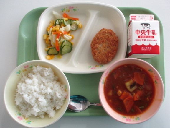 ・ごはん ・牛乳 ・スープカレー ・まぐろのミンチカツ ・ハニーレモンサラダ