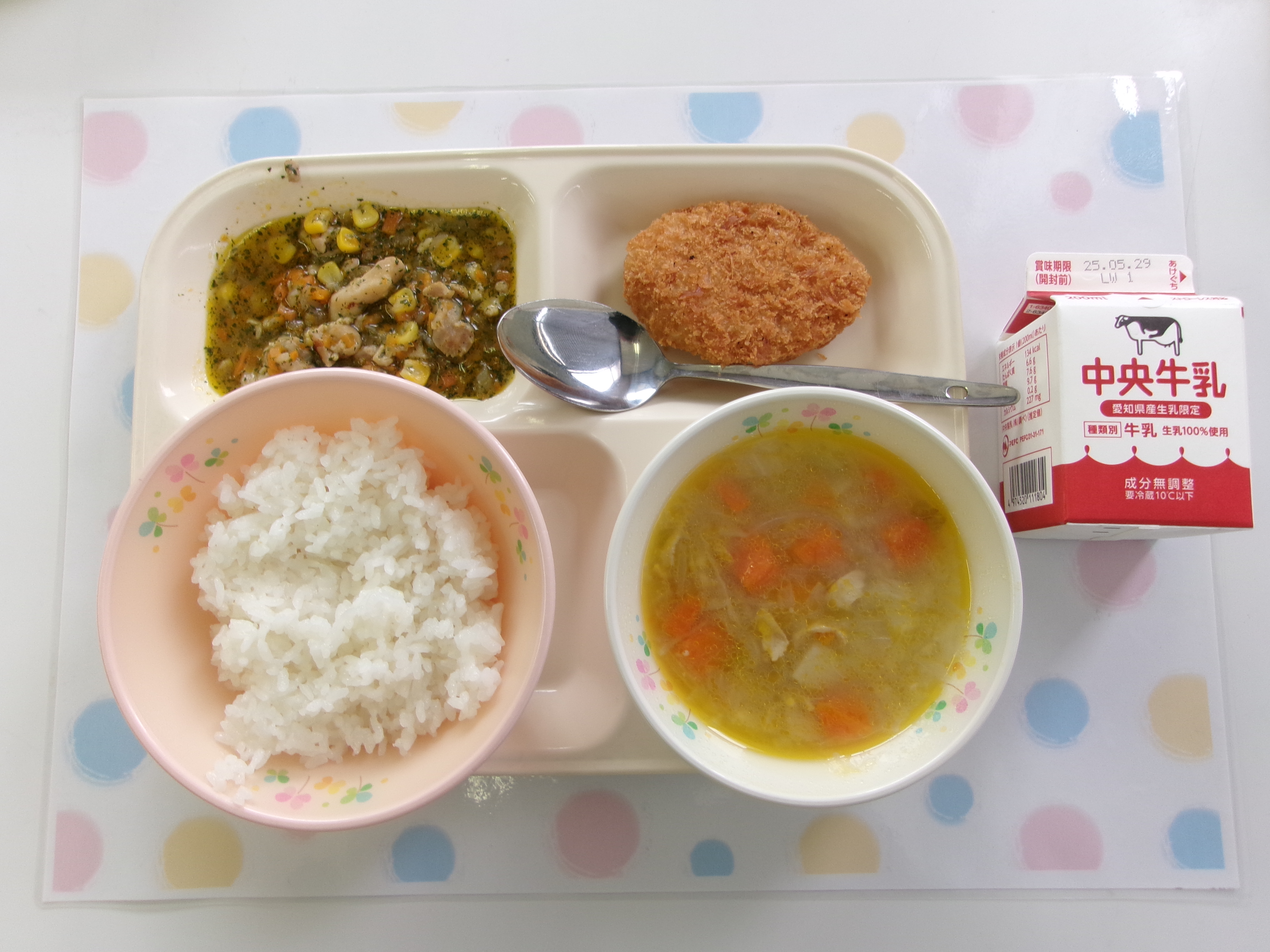 ・ごはん ・牛乳 ・スープカレー ・まぐろのミンチカツ ・ハニーレモンサラダ