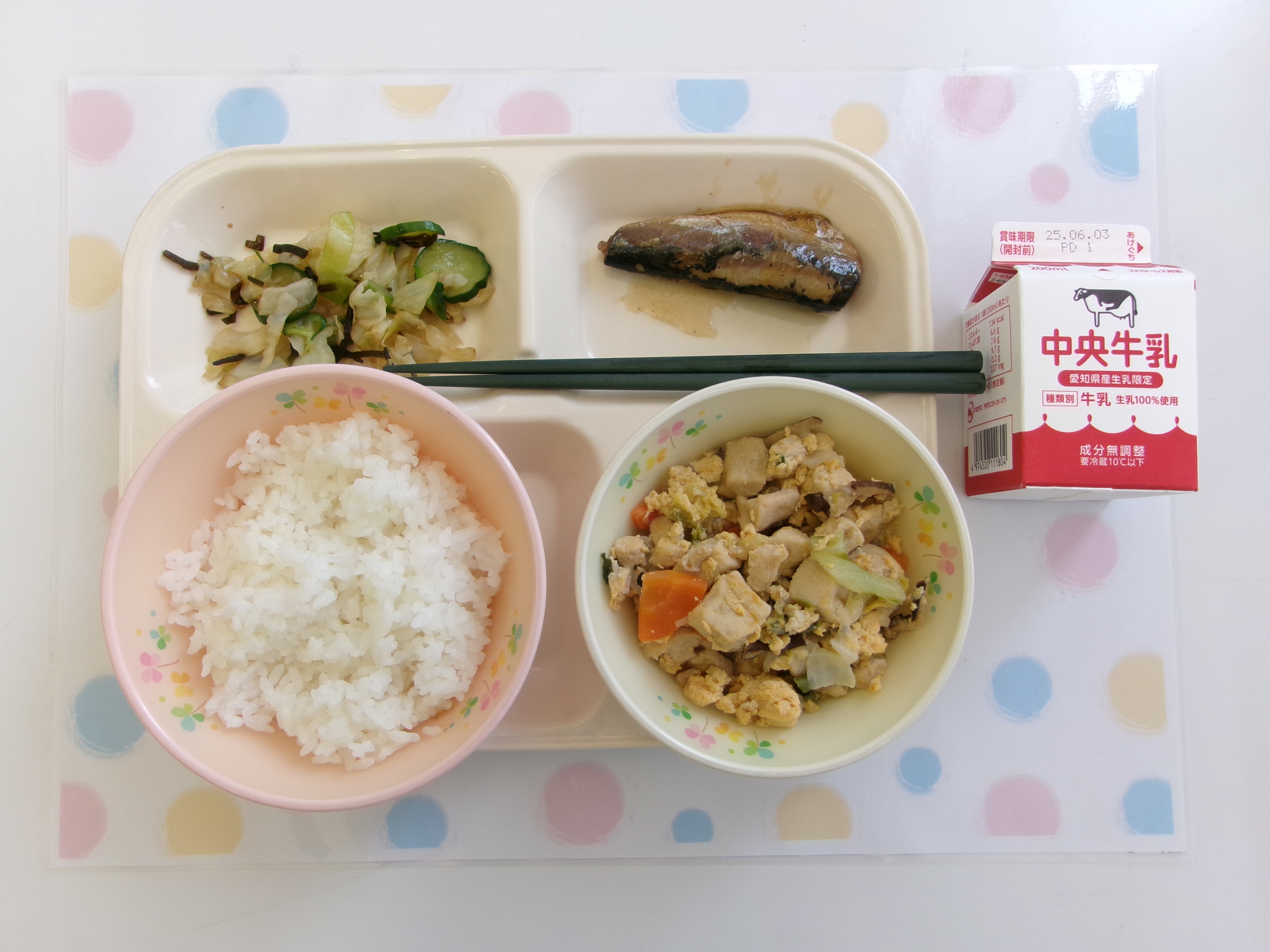・ごはん ・牛乳 ・高野豆腐の卵とじ ・いわしのしょうが煮 ・塩昆布和え