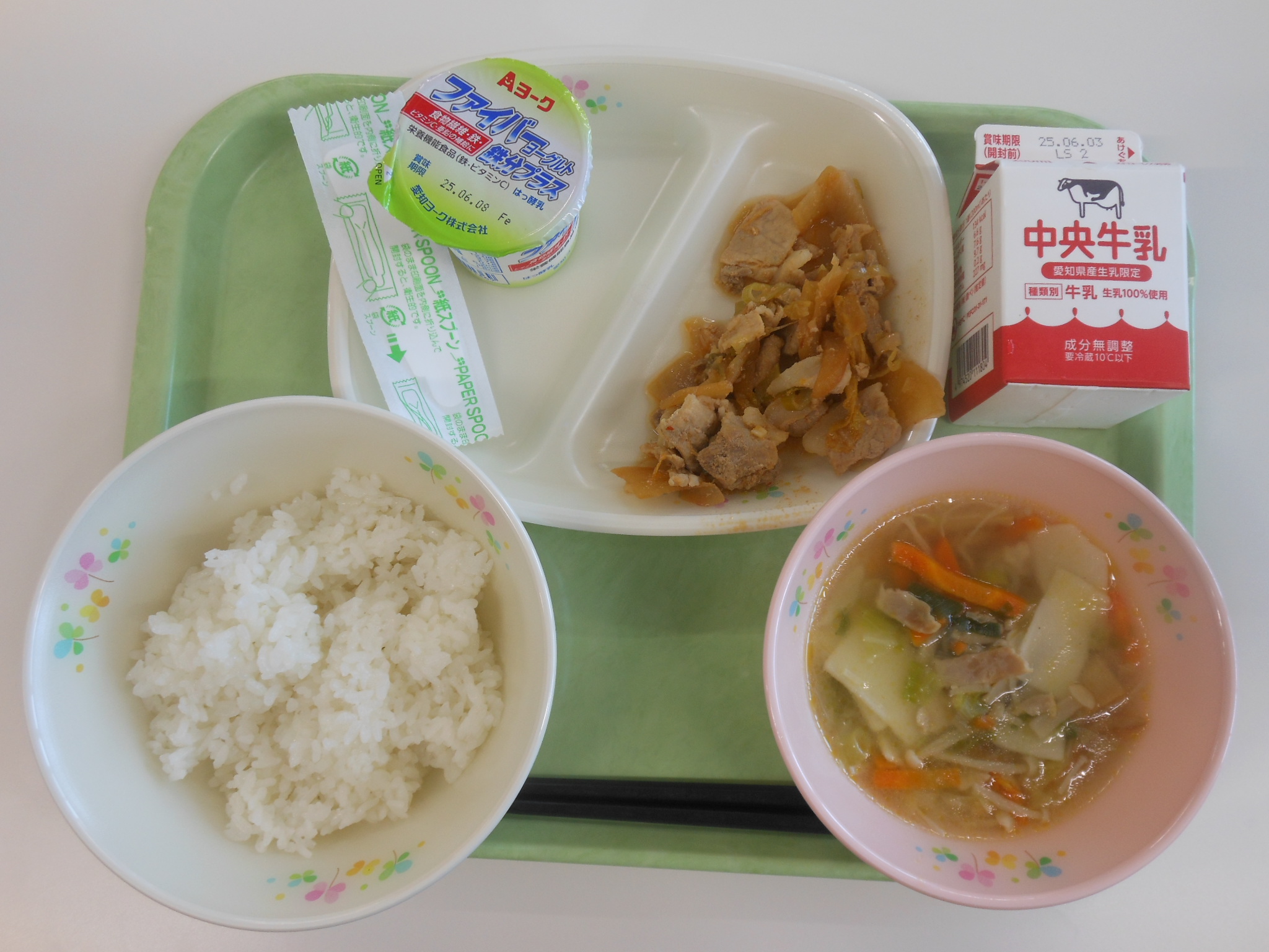 ・ごはん ・牛乳 ・新玉ねぎの豚汁 ・とり肉の竜田揚げ ・じゃこてん茶ふりかけ